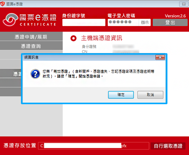 登入後出現申請畫面(含新開戶、憑證檔案遺失、忘記憑證密碼、憑證逾期等狀況),請點選「確定」即開始進行憑證申請。