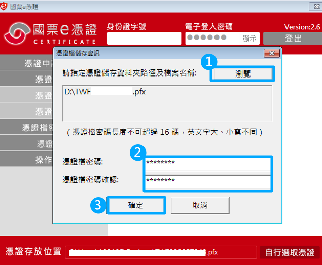 (2)設定憑證檔密碼、憑證檔密碼確認