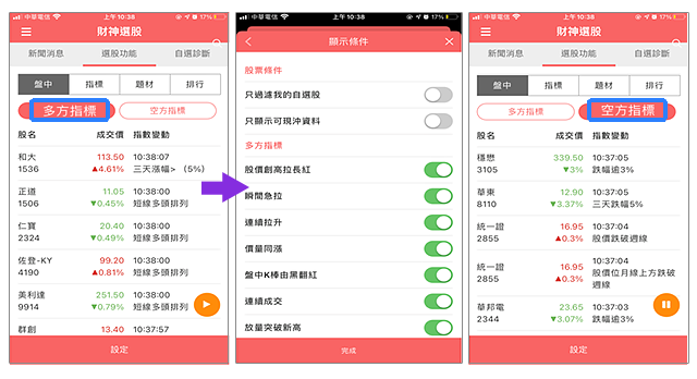 選股功能 盤中多空指標及盤後多種指標選股,讓您選股更多元