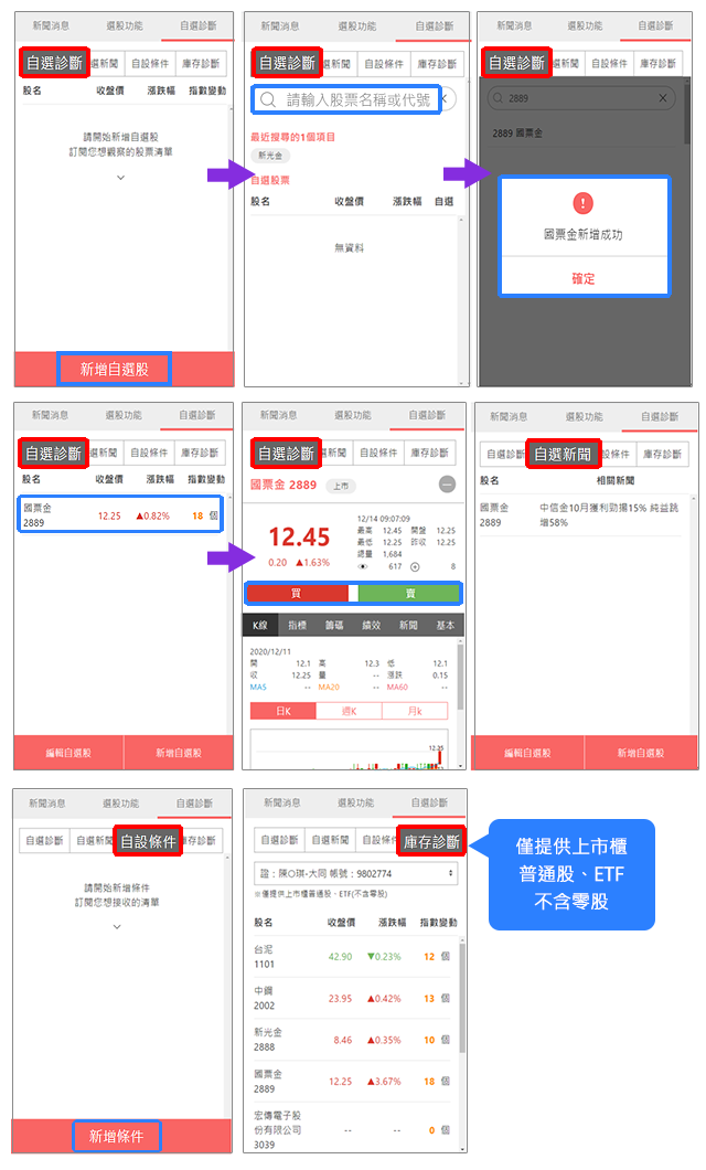 (4)自選診斷:提供自選診斷(自選商品上限為60檔個股且點個股可直接帶下單)、自選新聞、自設條件(上限30組)及庫存診斷(點個股可直接帶入下單)。