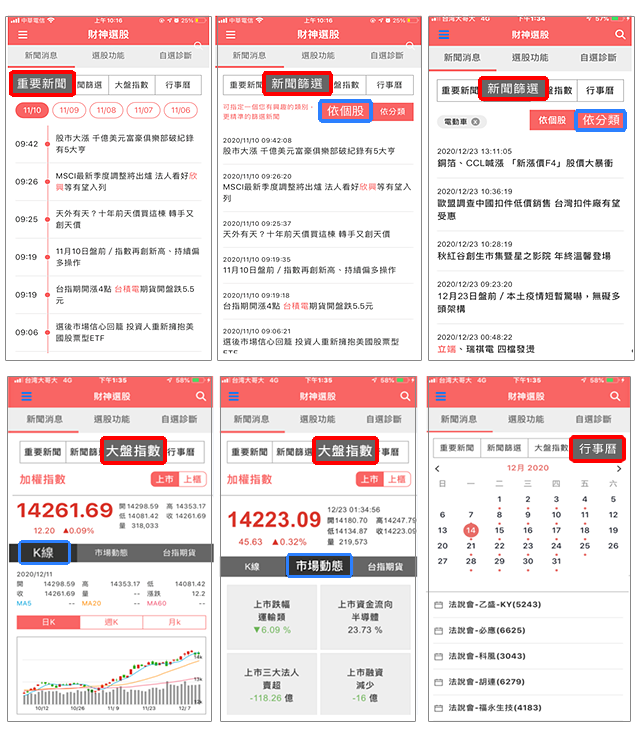 提供重要新聞(近五日新聞)、新聞篩選(可依個股或分類搜尋)、大盤指數(上市及上櫃指數之K線、市場動態及台指期貨)及行事曆(依日期顯示股市相關資訊)等功能。