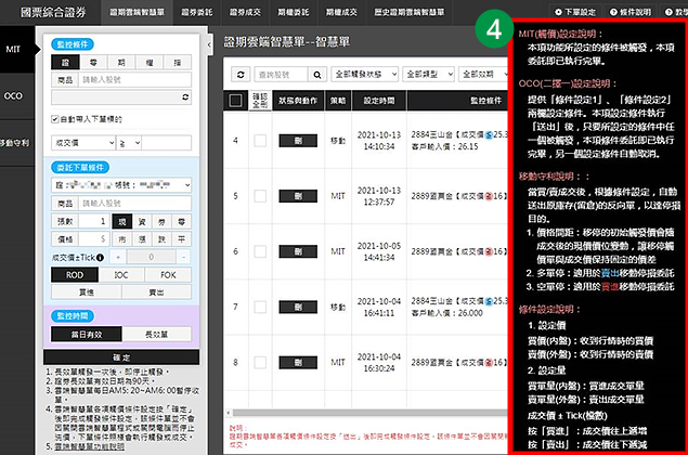 左邊下單設定分為「MIT」(觸價)下單區、「OCO」(二擇一)下單區。