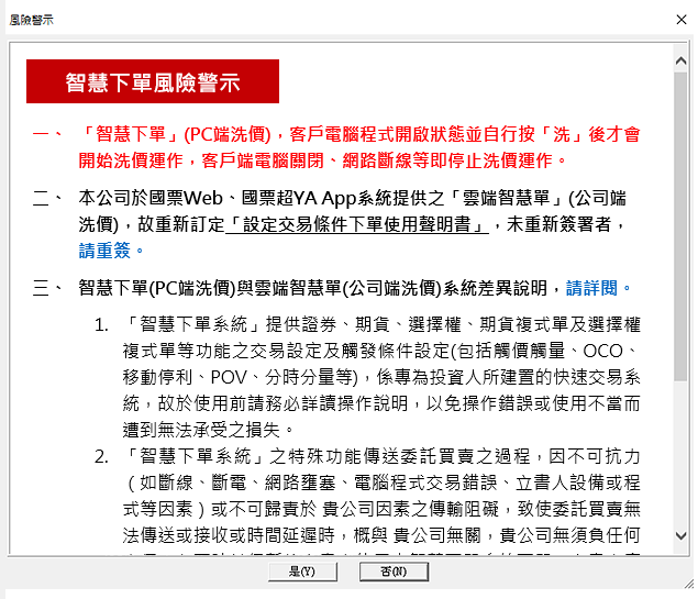 一、開啟「智慧下單」系統,會出現「風險警示視窗」,請務必瀏覽。