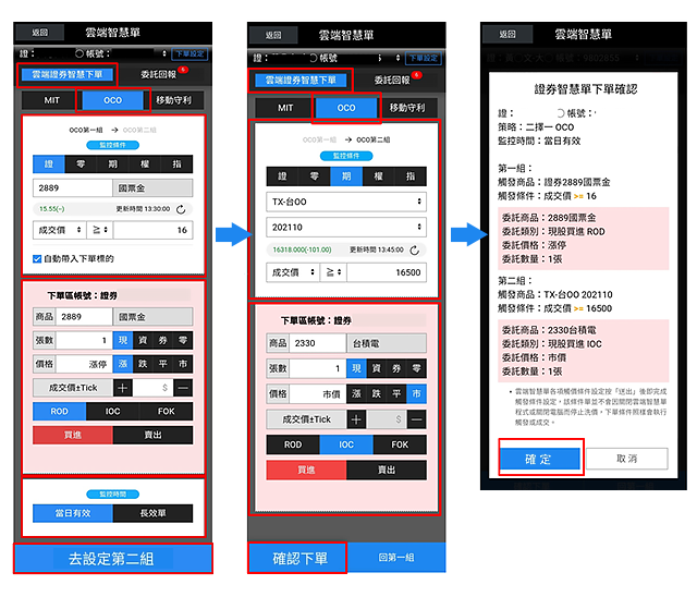 - 「OCO第一組」下單區、「OCO第二組」下單區:輸入欲下單的證券商品並請依各欄位點選輸入,按「確認下單」才會送出「OCO智慧單」。如下圖面說明: