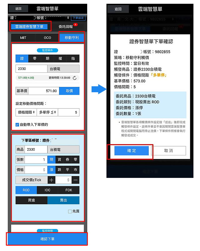 一、「帳號」:上面請選擇欲下單「證券帳號」。二、「證券雲端智慧下單」:分為「MIT」(觸價)下單、「OCO」(二擇一)下單、「移動守利」下單。三、「委託回報」:可查詢「MIT委託」、「OCO委託」及「移動守利委託」狀態。